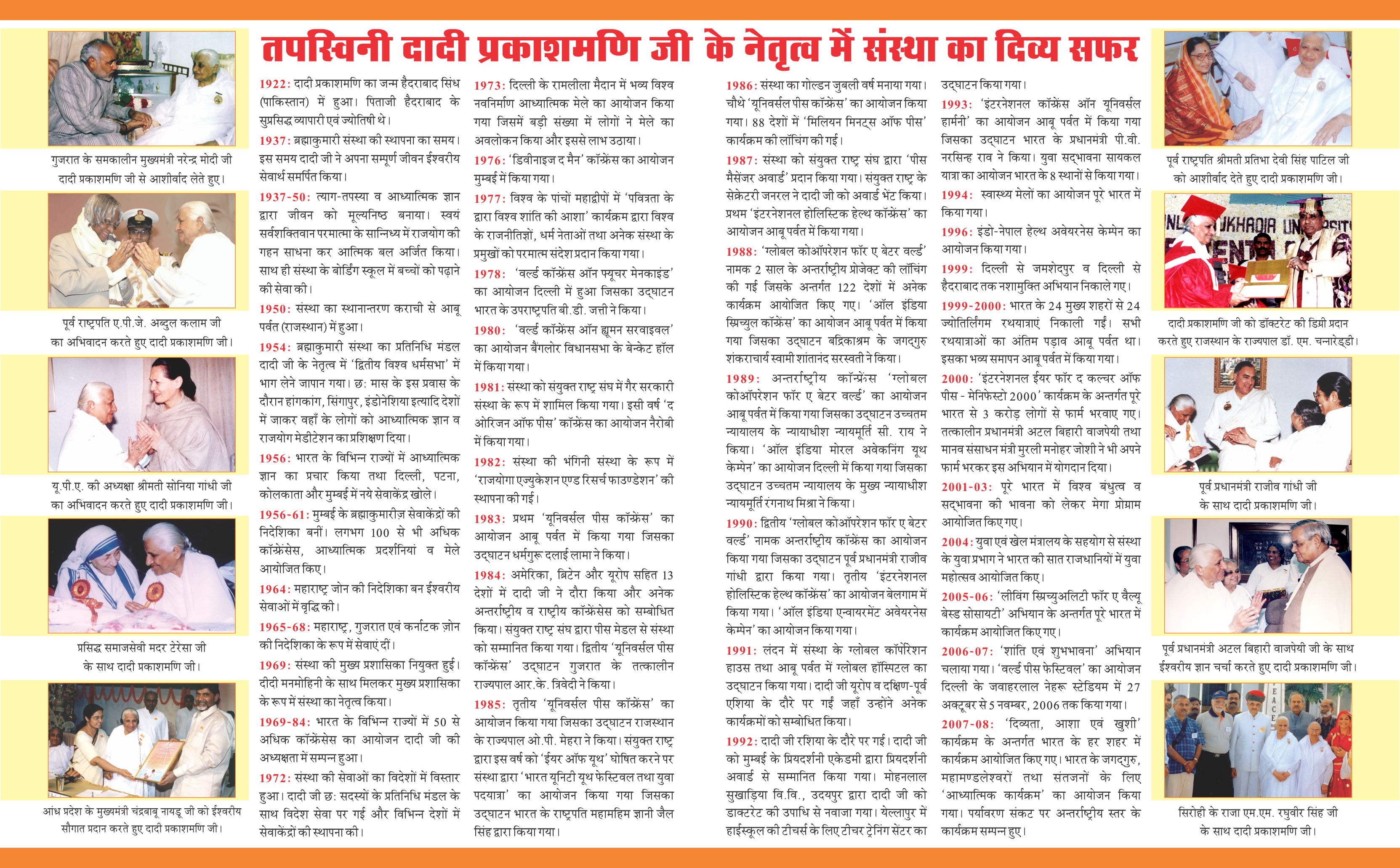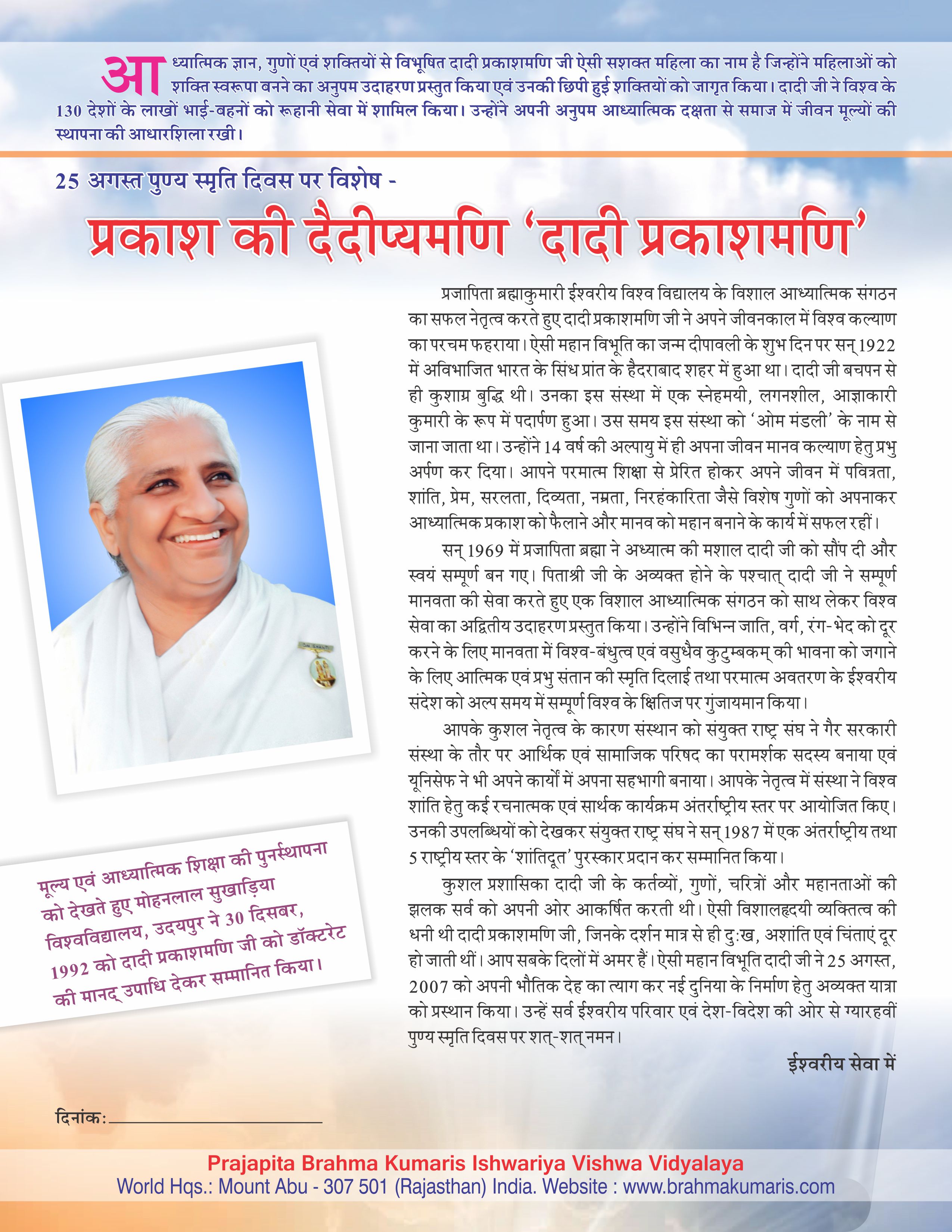 11th Ascension Anniversary of Dadi Prakashmani, Former Chief of Brahma Kumaris (25th Aug.)