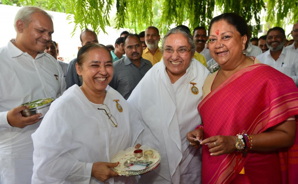 BK Sushma and BK Chandrakala from the Brahma Kumaris Centers in Jaipur tied Rakhi to Smt. Vasundhara Raje, the Honorable Chief Minister of Rajasthan. Godly Gifts and sweets were also given to her as a celebration of the Rakshabandhan Festival.
