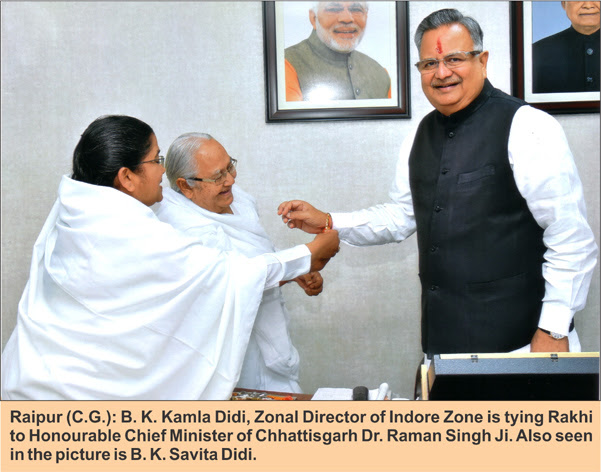 The Rakhi Festival was celebrated with great enthusiasm by the Brahma Kumaris of Raipur, Chhattisgarh. BK Kamla, Zonal Director of the Brahma Kumaris in Chhattisgarh, tied sacred Rakhi to Honorable Chief Minister Dr. Raman Singh and presented him with a Godly gift and blessings.
